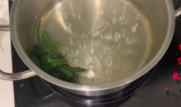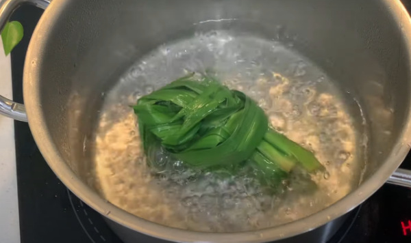 - Đun sôi 700ml nước với 2 lá dứa, nước sôi thì vớt lá dứa ra, cho hỗn hợp đường + bột agar vào, vừa cho vào vừa khuấy đều hỗn hợp để không bị vón cục.