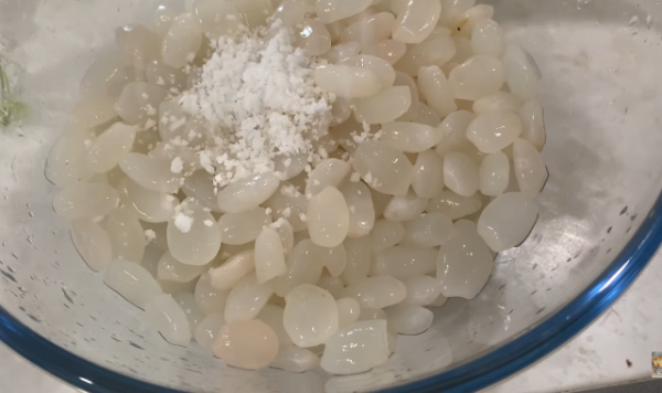 - 500g hạt đác tươi bạn rửa sạch, đổ ra rổ và bóp cùng 1 thìa muối cho hạt đác đỡ bị nhớt. Rửa sạch hạt đác với nước sạch 1-2 lần nữa rồi tiến hành rim.