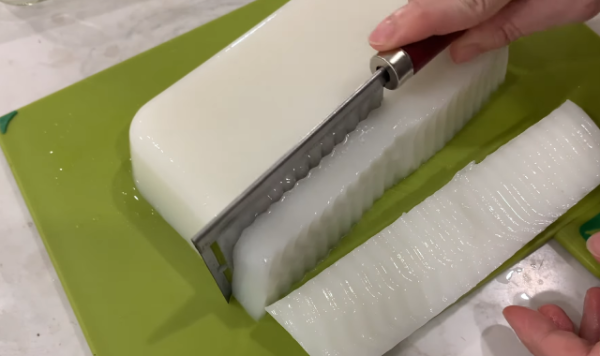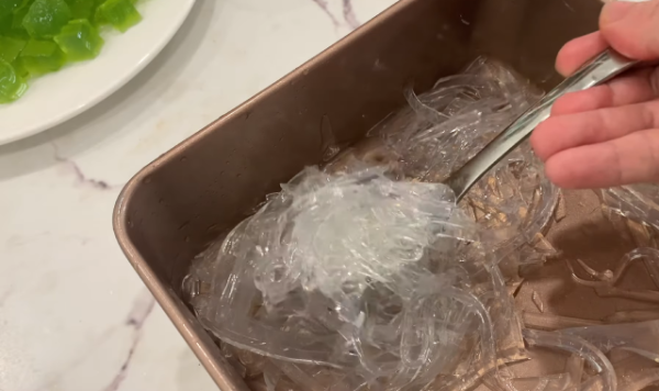 - Cắt thạch 3 vị thành các miếng vuông vừa ăn, với thạch sợi giòn, bạn cắt thành các sợi nhỏ nhé.