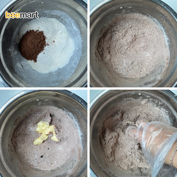 - Cho 30g bơ lạt vào hỗn hợp bột, bóp đều đến khi đều (bóp thử 1 phần bột bất kì sẽ thấy độ kết dính 1 chút)