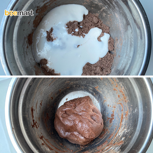 - Cho bột mì, bột sữa, bột nở, muối, đường, 20g bột cacao vào 1 chiếc tô