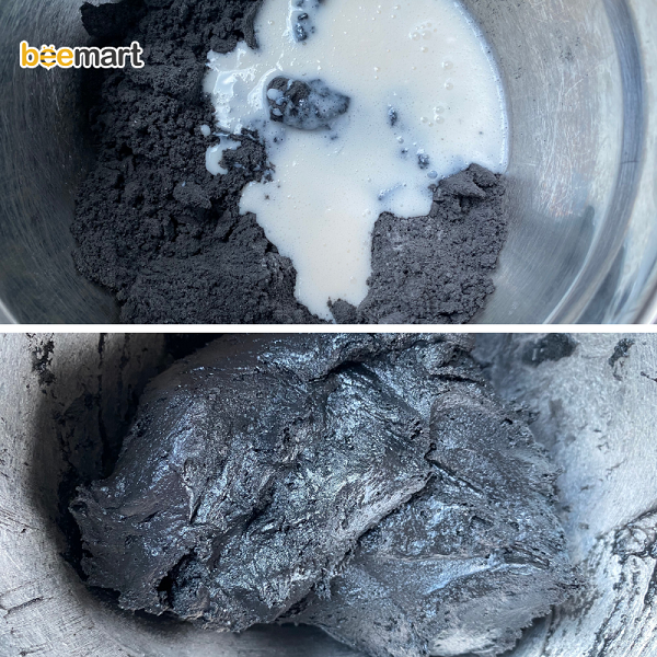 - Cho bột mì, bột sữa, bột nở, muối, đường và tinh than tre vào 1 chiếc tô
