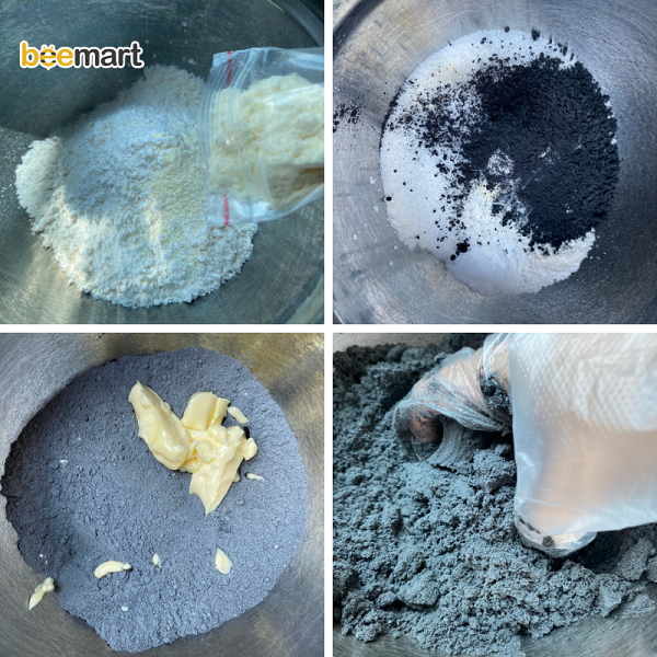 - Cho 30g bơ lạt vào hỗn hợp bột, bóp đều đến khi đều (bóp thử 1 phần bột bất kì sẽ thấy độ kết dính 1 chút)