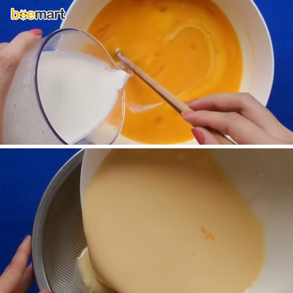 + Cuối cùng, lọc hỗn hợp trứng sữa qua rây để loại bỏ cặn và sánh mịn hơn.