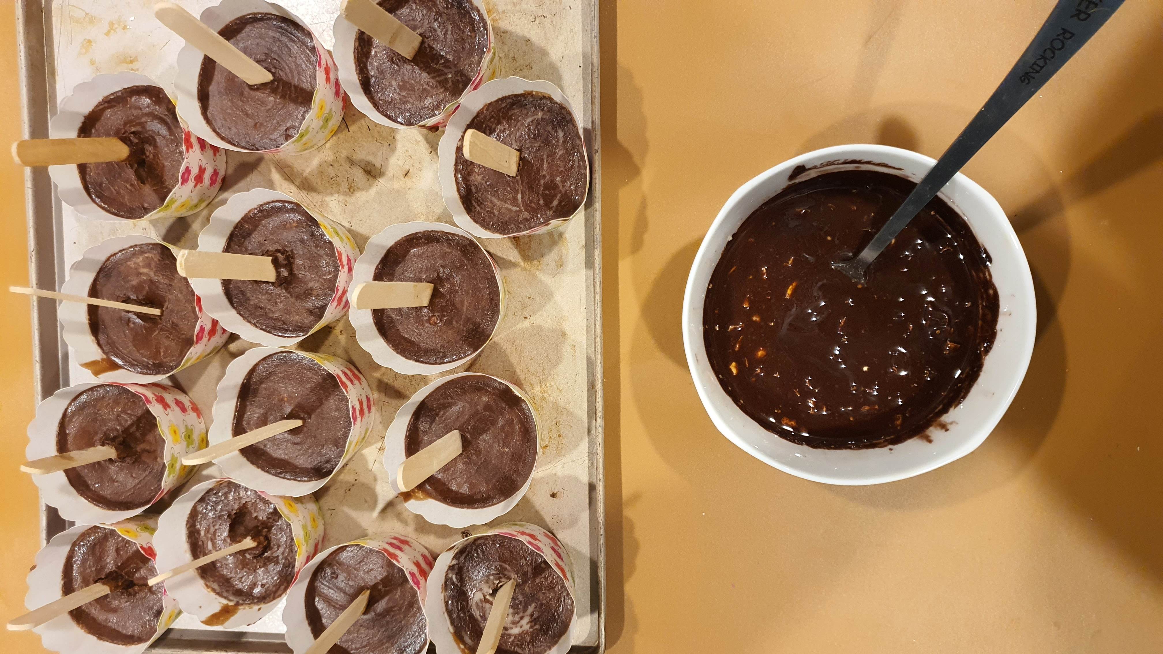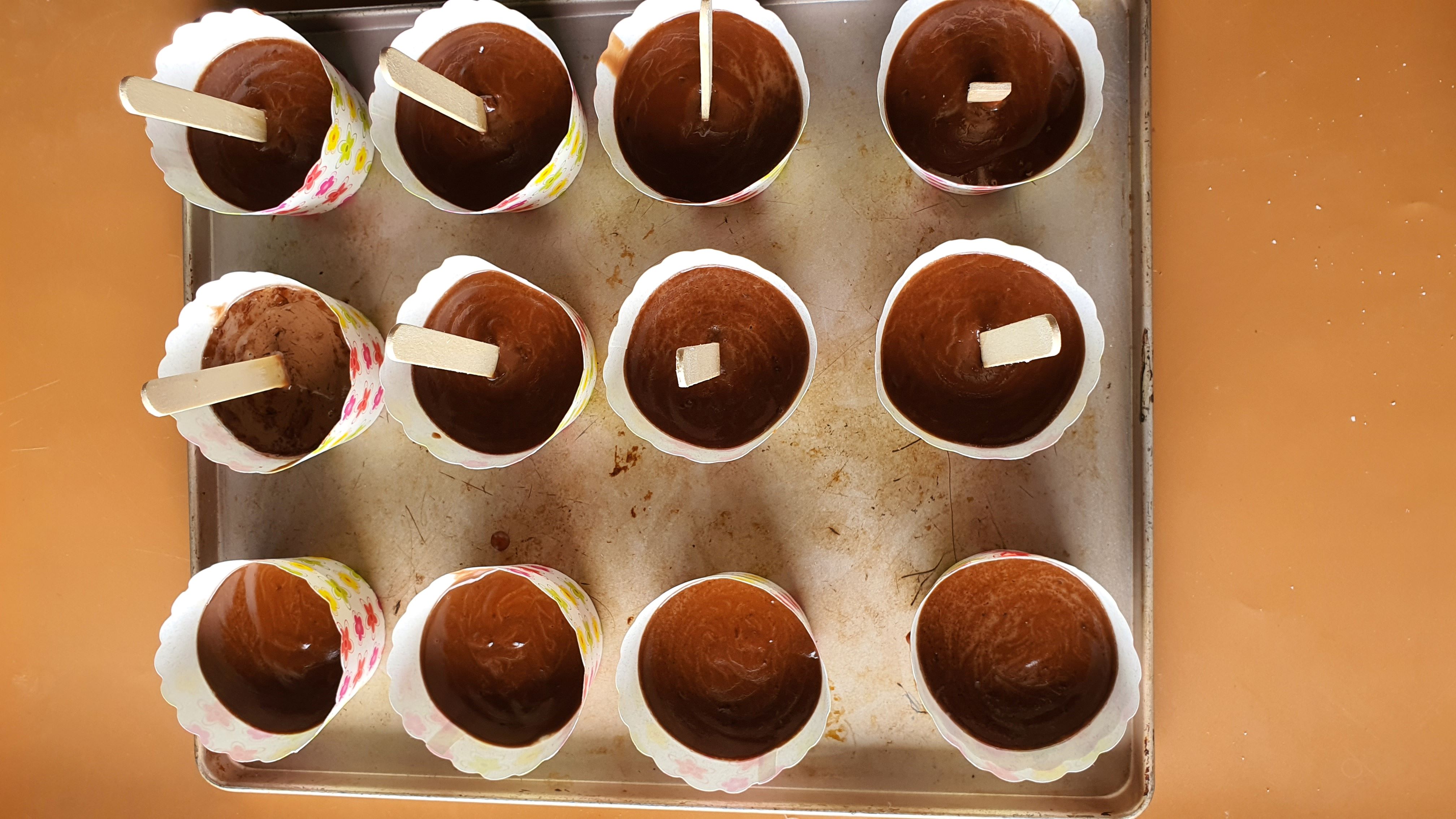 - Để trong tủ lạnh tầm 15 phút khi mặt kem bắt đầu se lại, cho que kem cắm vào giữa khuôn