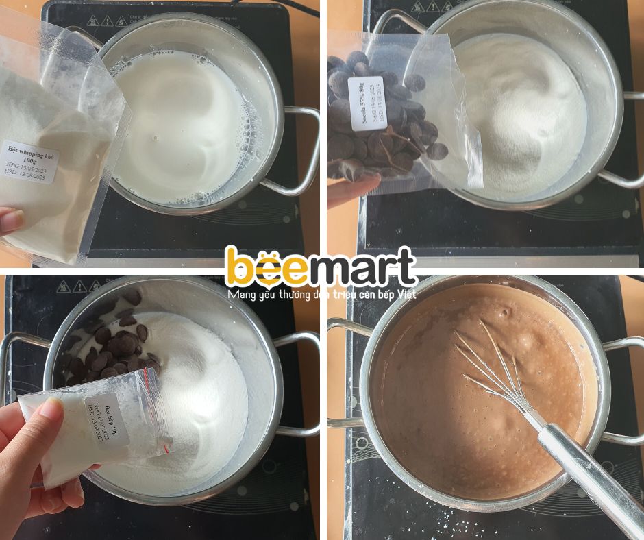Cho 440ml sữa + 150g bột whipping + 80g socola + 20g bột bắp vào nồi khấy đều