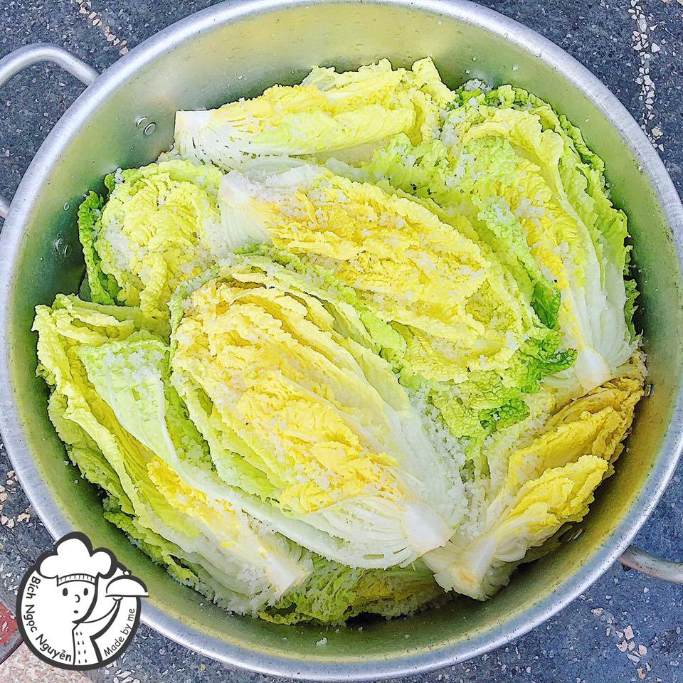 - Bước 1: Ướp muối trắng lên cải thảo. Để 2 tiếng rồi rửa thật kĩ cho hết mặn (theo như người Hàn chia sẻ, cải thảo Việt Nam chỉ cần 2 tiếng. Còn loại cải thảo ở bên Hàn thì cần 8 tiếng).