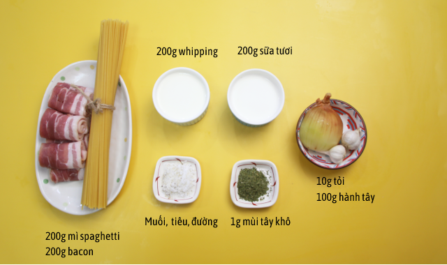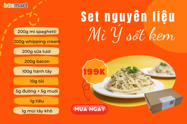 Để làm món mì Ý sốt kem béo ngậy thì bạn sẽ cần chuẩn bị mì spaghetti, whipping cream, sữa tươi không đường, bacon, hành tây và các gia vị. Tùy vào sở thích mà có thể thay thế bacon thành tôm, cá hồi, ức gà tùy theo sở thích. Nhưng nhiều khi có ít người ăn mà mua nhiều sẽ hơi lãng phí, nên Bee đã chuẩn bị set nguyên liệu mì ý sốt kem dành riêng cho 2 người với full topping, đảm bảo không lo thừa thiếu, rất vừa vặn nha! Tham khảo Set nguyên liệu đầy đủ món Mì Ý sốt kem nhà Bee tại đây: