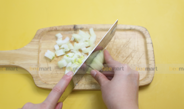 - Hành tây gọt vỏ, rửa sạch rồi cắt thành các miếng hình hạt lựu
