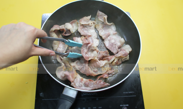 - Chuẩn bị 1 cái chảo chống dính. Để bếp ở lửa vừa, áp chảo bacon đến khi vàng đều 2 mặt rồi cắt thành các miếng vừa ăn