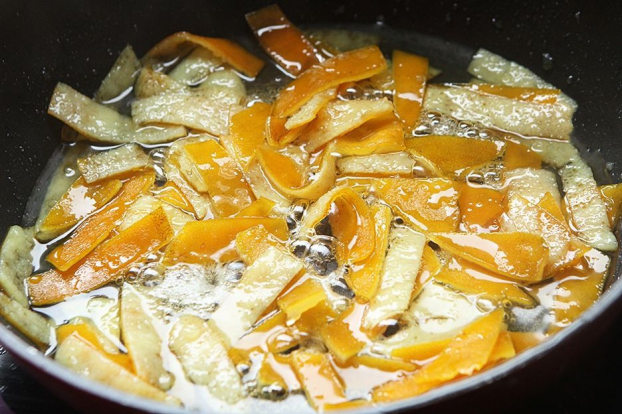 Đun sôi cho đến khi đường tan chảy rồi hạ nhỏ lửa đun cho đến khi vỏ cam chuyển màu trong và đường sánh lại như siro.