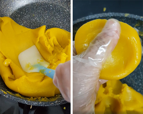 - Bước 5: Sau khi nhân hoàn thành, bạn có thể sử dụng ngay để làm bánh Trung thu rồi! Hoặc nếu chưa dùng ngay, bạn có thể chờ cho nhân nguội rồi cho vào túi zip cấp đông, bảo quản được 3 tháng.