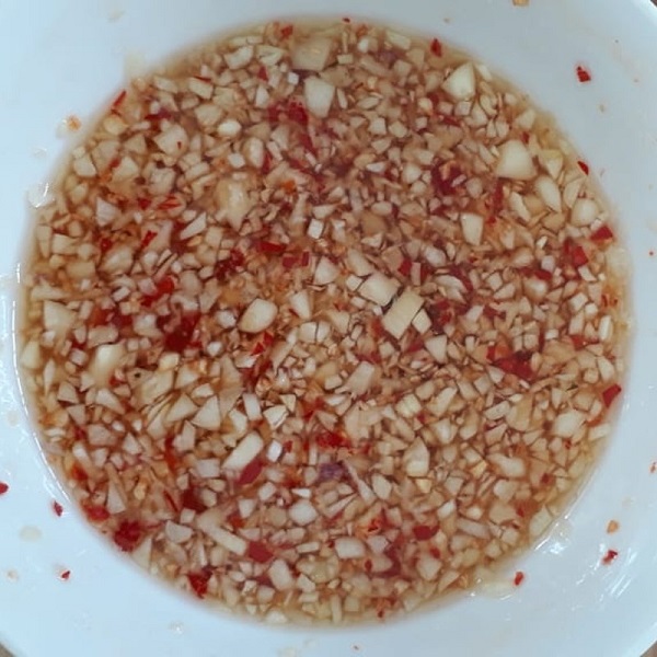 + Cho vào chén hỗn hợp gia vị gồm: 2 muỗng canh nước mắm, 2 muỗng canh đường, phần tỏi ớt đã sơ chế và nước cốt của 1 quả chanh. Sau đó đảo đều để hòa tan gia vị.