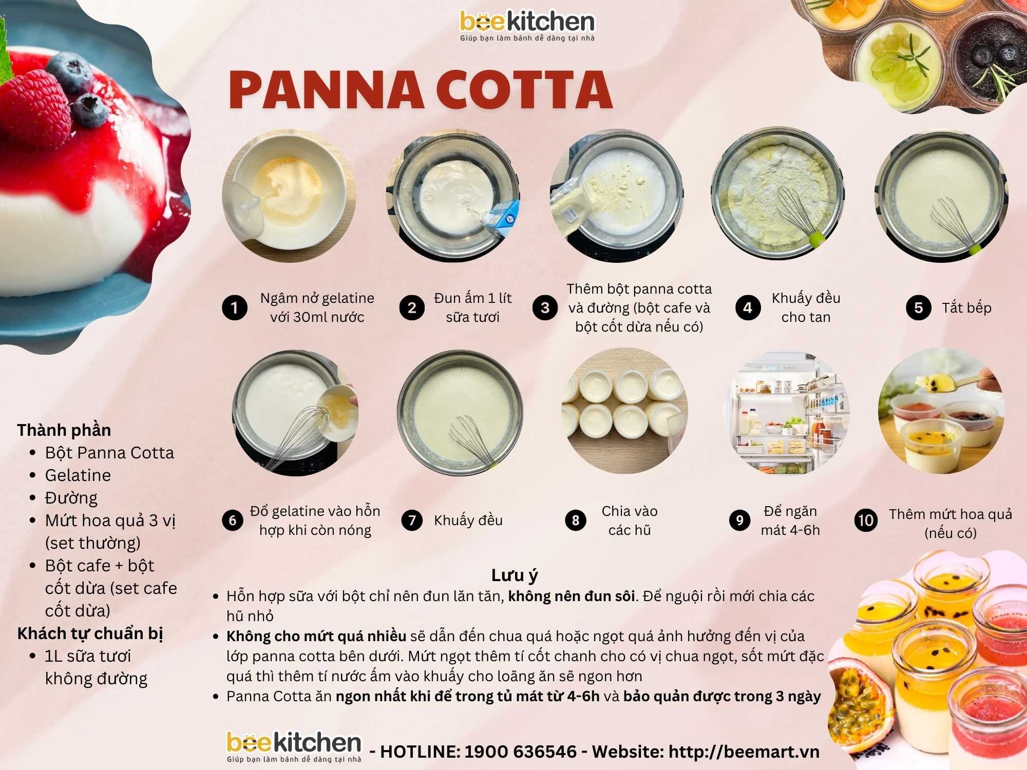 Freeship đơn đầu tiên khi nhập mã "FREEMOI"Panna cotta là một trong những món tráng miệng đơn giản, dễ làm nhất nhưng hương vị thì vô cùng hấp dẫn. Panna cotta được kết hợp giữa hoa quả tươi, kem tươi, sữa tươi và gelatine để tạo đông. Panna cotta cũng dễ dàng được biến tấu tùy theo khẩu vị và sở thích của bản thân. Hôm nay hãy cùng Bee vào bếp để thử ngay công thức panna cotta với 5 vị vô cùng thơm ngon, hấp dẫn này nhé!