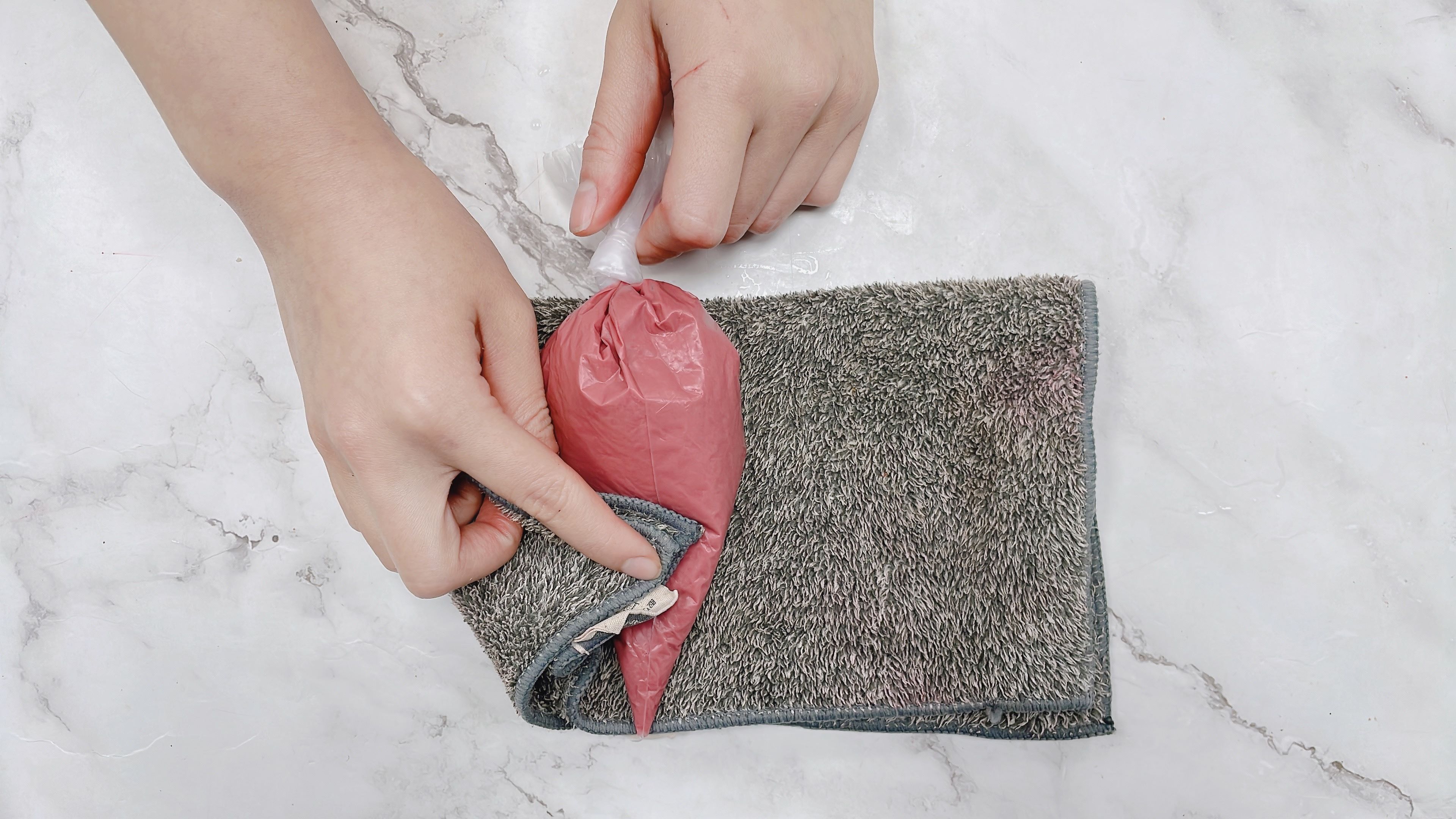 Nhấc socola ra khỏi bát nước nóng, dùng khăn sạch lau khô túi và dùng tay xoa đều túi cho tới khi socola nguội