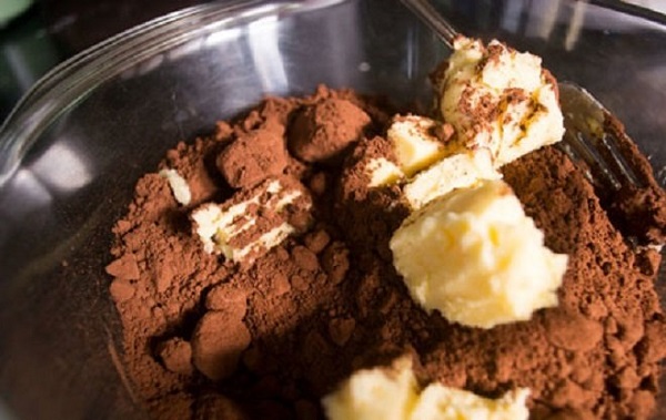 Bước 1: Đầu tiên cho bơ đã để ở nhiệt độ phòng vào 1 chiếc nồi, rây bột ca cao vào và dùng phới đánh tan để bơ và ca cao quyện vào nhau.