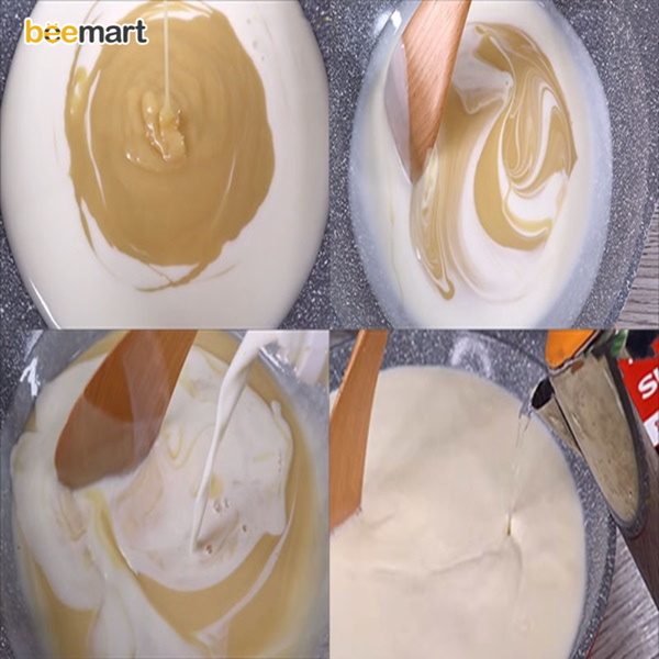 - Các bạn cho nước vào nồi đun đến khi sôi lăn tăn thì tắt bếp. Đổ nước ra một cái âu rồi tiếp đó cho sữa đặc vào, dùng thìa khuấy đều để hòa tan hết sữa (lưu ý chỉ khuấy theo một chiều)