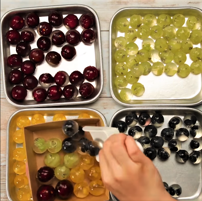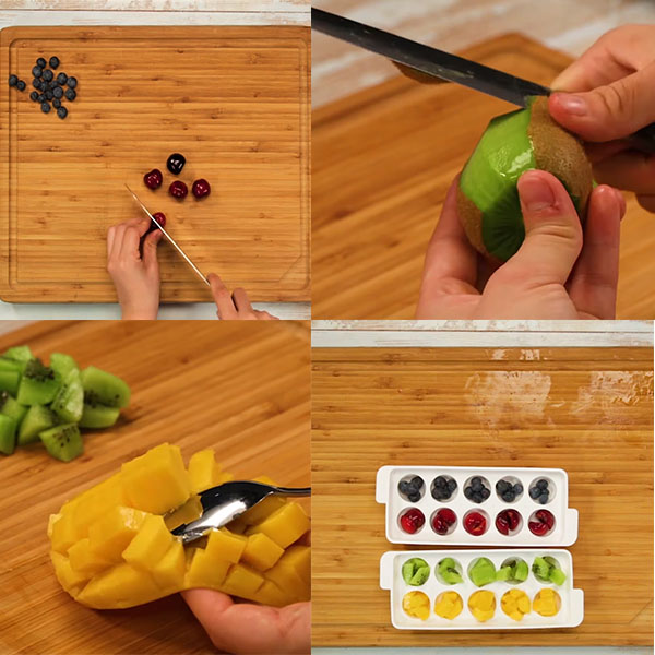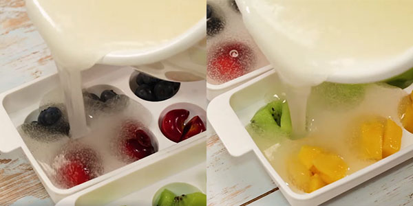 - Bước 3: Xếp trái cây vào khay làm thạch tùy theo sở thích của bạn, rồi rót hỗn hợp thạch vào, đậy nắp và để nguội mới cho vào ngăn mát tủ lạnh 2 tiếng.