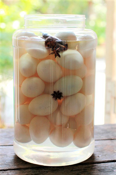 - Bước 3: Trứng vịt rửa sạch, lau khô hoặc để khô ráo, xếp vào lọ thủy tinh hoặc lọ nhựa, đổ hỗn hợp nước rượu ngâm vừa làm vào và ngâm từ 21 - 30 ngày.
