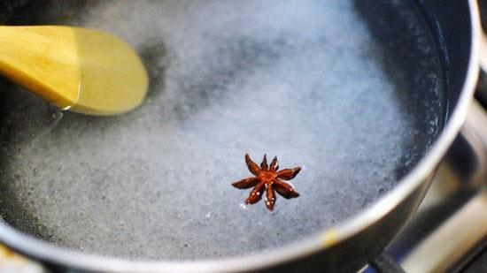 - Bước 1: Rang thơm quế và hồi trong khoảng 5 phút, sau đó thêm muối, đường và 2 lít nước vào đun đến khi sôi. Tắt bếp để nguội bớt nhưng vẫn giữ độ ấm khoảng 40 - 45 độ C.