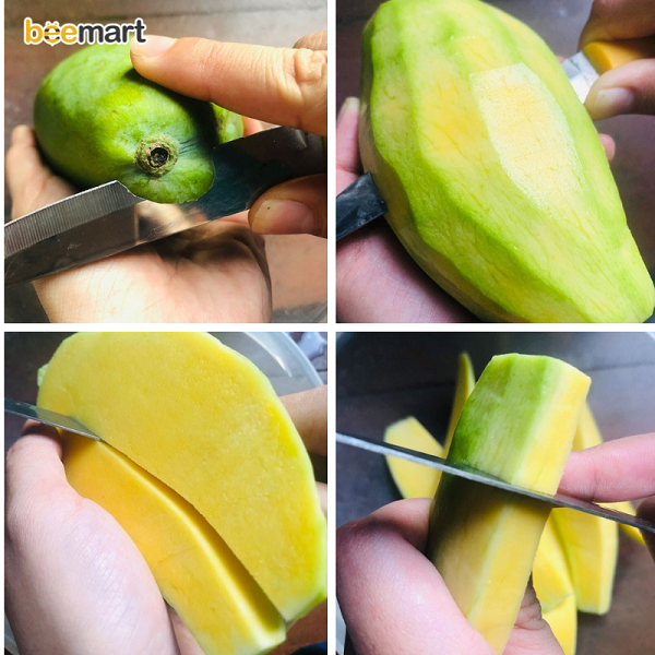 + Xoài gọt bỏ vỏ, rửa thật sạch dưới nước. Sau đó cắt thành khúc vừa ăn