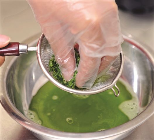 - Bước 2: Lá dứa rửa sạch, xay 15 lá với 400ml nước, lọc bã lấy nước cốt.