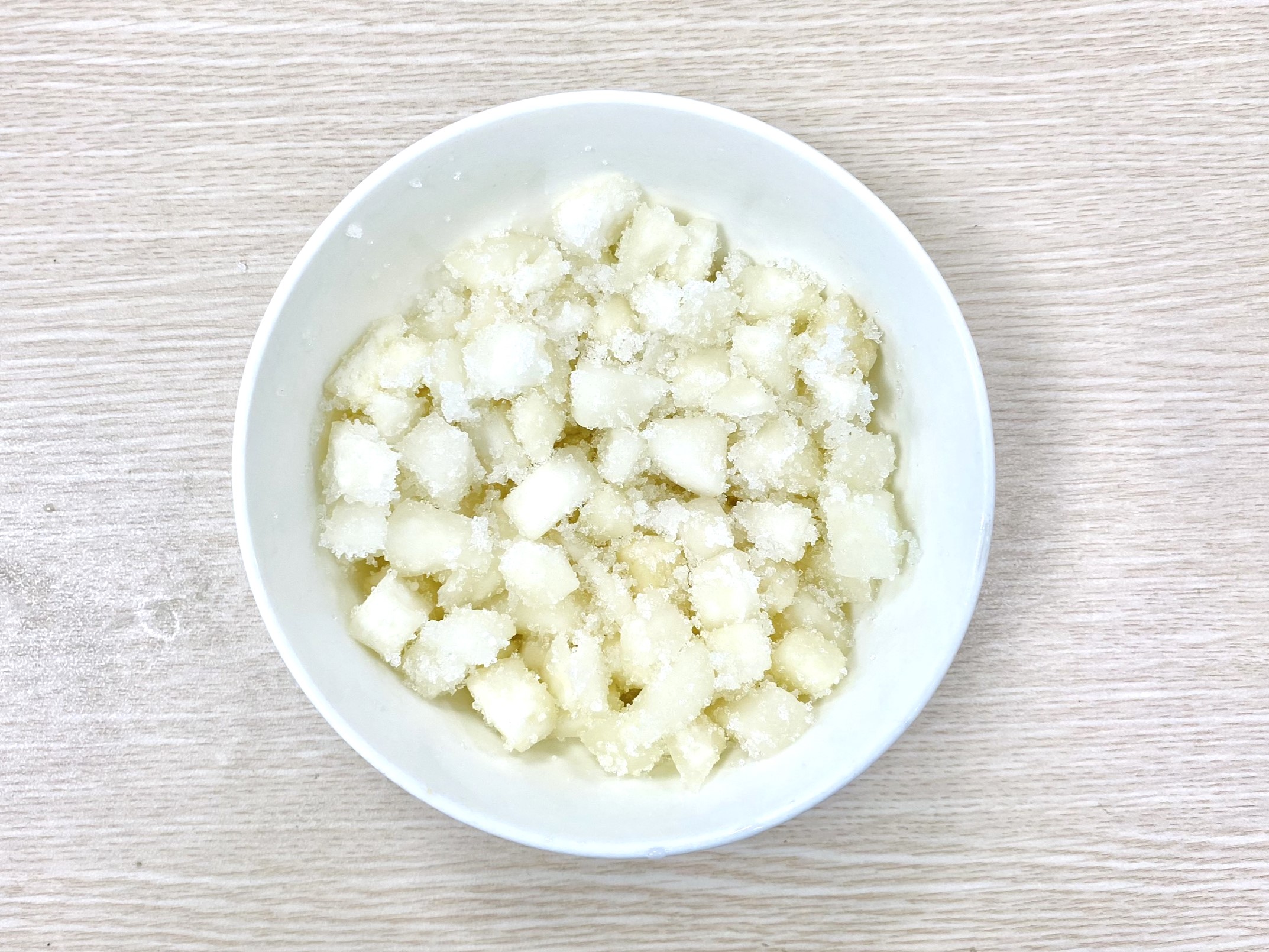 - Sau đó đổ 100g đường kính vào bát cùi bưởi và trộn đều, để cùi ngấm đường trong vòng 1 tiếng.