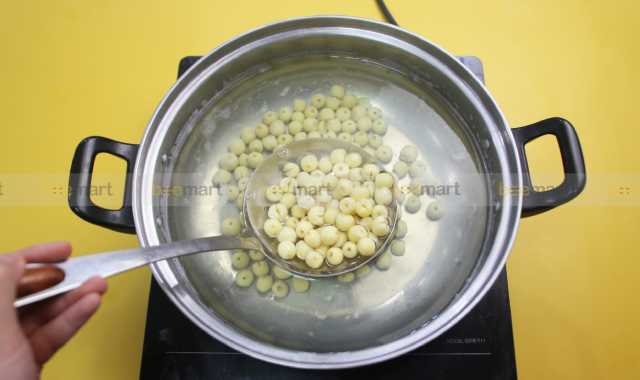 - Bật bếp ở lửa vừa, đun đến khi nước sôi thì hạ nhỏ lửa, ninh thêm khoảng 20 phút nữa cho hạt sen chín mềm và bở