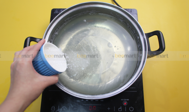 - Thêm 200g đường phèn vào nước ninh sen, nấu đến khi tan đường rồi tắt bếp