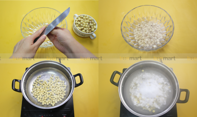 - Chuẩn bị 300g nước lạnh. Luộc qua hạt sen với nước đến khi sôi thì đổ ra, rửa sạch lại với nước lạnh lần nữa để loại bỏ bụi bẩn
