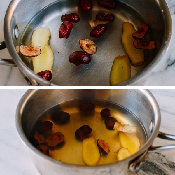 Sau đó thêm 2 chén nước lọc vào một nồi nhỏ cùng với gừng và táo tàu vào. Đun sôi nước trà với lửa lớn.