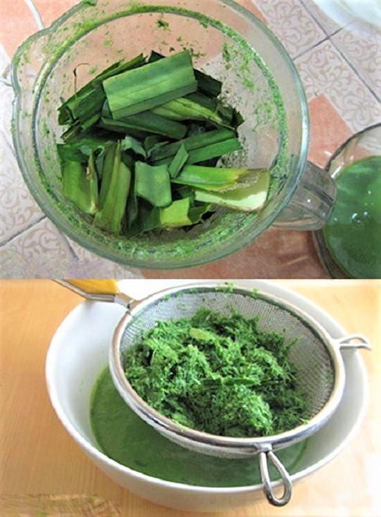 - Bước 1: Lá dứa rửa sạch cắt nhỏ, cho vào máy xay cho nước xâm xấp mặt lá dứa xay nhuyễn. Lọc qua rây lấy nước cốt lá dứa.