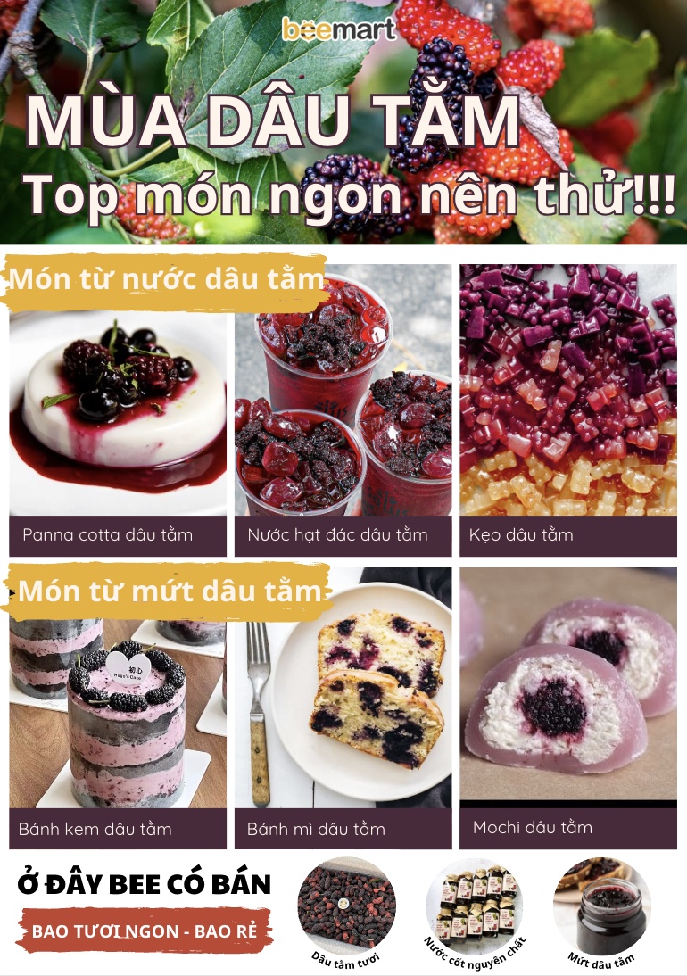 >>> Dâu tằm tươi Beemart đã về hàng. Bạn đặt trước Ở ĐÂY nhé. Beemart sẽ trả dâu tươi sau 2 ngày đặt hàng (trả dâu tươi vào thứ 5 hàng tuần). Hỗ trợ tư vấn và hướng dẫn bạn cách để làm 10+ món từ dâu tằm cực ngon tại nhà!