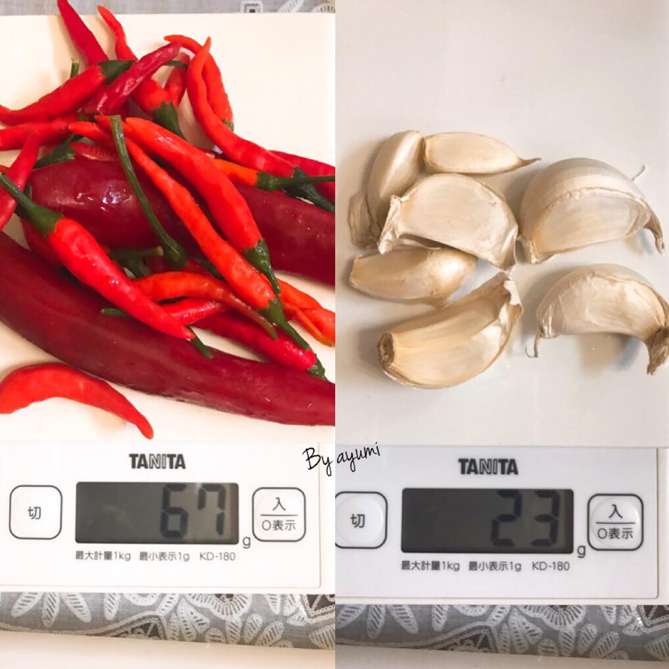 - 67g ớt đỏ bỏ hạt (2 trái ớt sừng, còn lại ớt đỏ nhỏ)