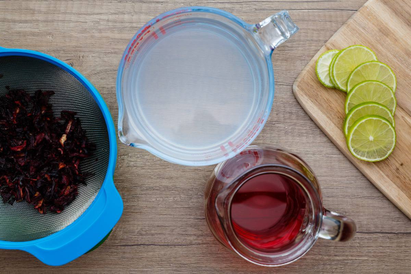 Bước 4: Bạn gạn nước hoa atiso (hibicus) ra, bỏ phần cái đi. Đổ phần nước vào hỗn hợp nước cốt chanh, mật ong ở trên và khuất đều.