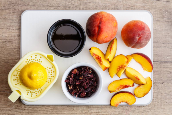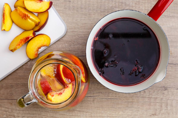 Bước 3: Đổ mật ong vào phần nước lọc còn lại (4 cup), khuấy đến khi hòa tan. Tiếp tục thêm đào và nước cốt chanh.