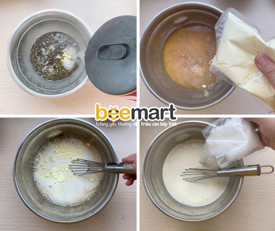 Khi nước trà còn nóng nhanh tay đổ bột sữa béo, siro đường vào khuấy đều ta sẽ thu được hỗn hợp trà sữa.