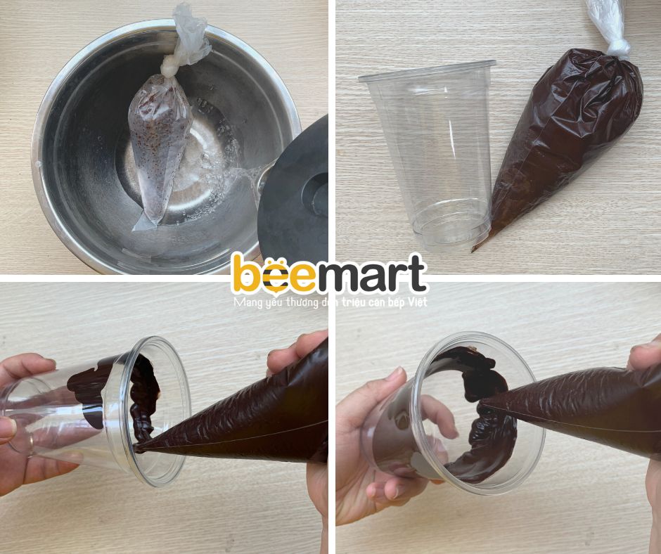 Ngâm túi socola có sẵn trong set với nước nóng đến khi socola tan chảy hoàn toàn. Trong quá trình ngâm có thể nhấc lên bóp đều để socola đảm bảo tan chảy hết, không vón cục bên trong.