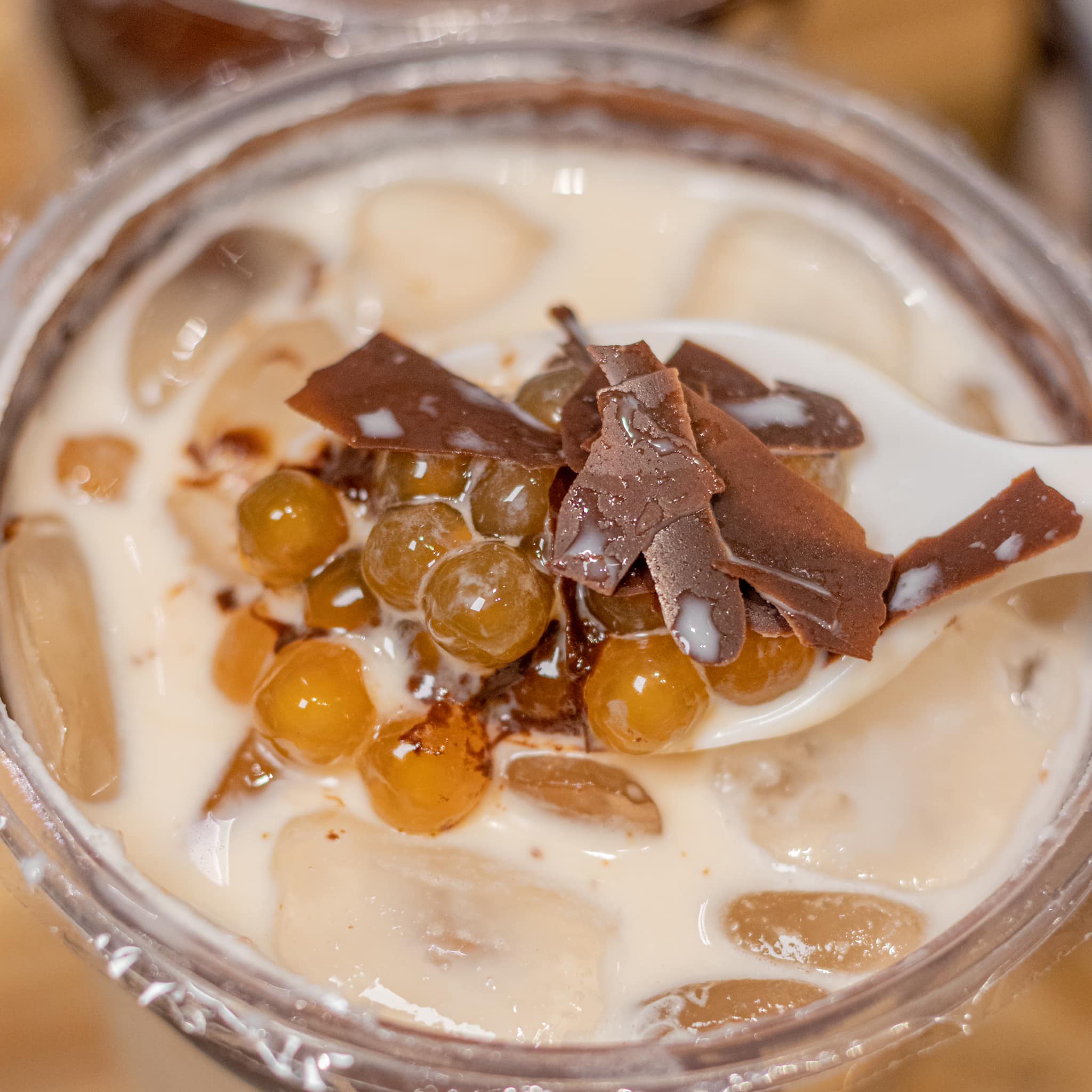 Lấy phần trà sữa đã làm mát và cốc socola đã đông ra khỏi tủ, lần lượt cho thêm đá, trà sữa vào cốc socola. Cho trân châu 3q lên trên làm topping là hoàn thành.