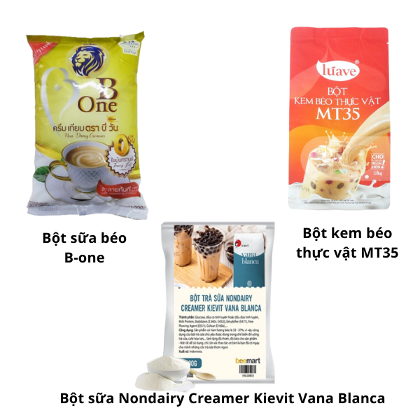 Một số loại bột kem sữa bạn có thể tham khảo như B-one, bột kem béo thực vật MT35, bột sữa Kievit,... là chọn hoàn hảo cho công thức này nhờ chứa lượng chất béo 33-37% vừa giúp làm tăng độ ngậy béo trong trà sữa mà còn làm cân bằng lại hương vị đậm của trà ô long.