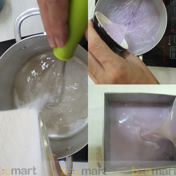- Đảo đều cho tan, cho lên bếp đun đến khi hỗn hợp sôi lại được 5 phút, đổ ra khuôn thạch theo ý muốn
