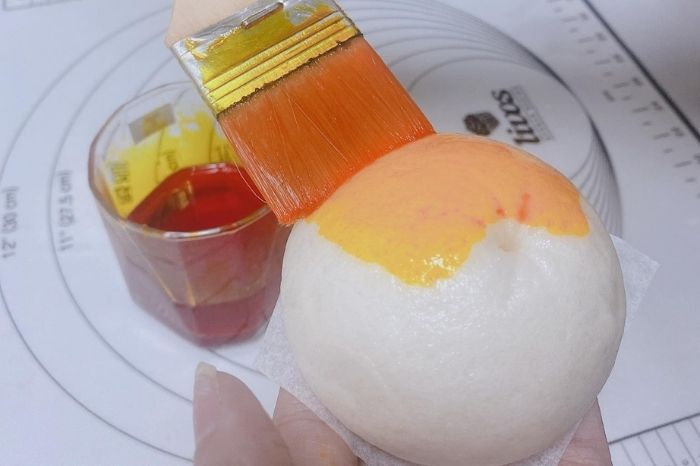 - Nếu như các bạn không có máy phun có thể sử dụng một chiếc cọ thật mềm để quét màu lên toàn mặt bánh. Hãy nhớ sử dụng màu gel pha với nước lọc để có màu chuẩn hơn, đặc biệt có thể thử bánh bao quả cam thêm chút màu xanh mới lạ nhé!