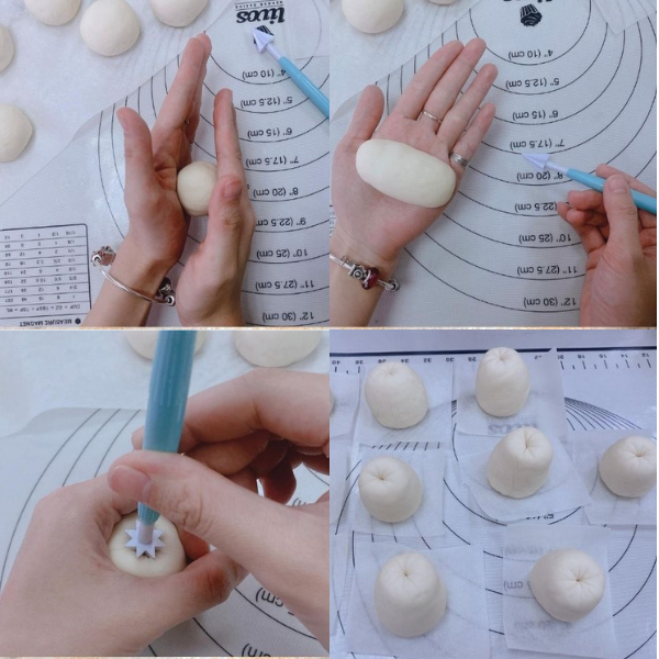 - Túm bột lại và vê tròn viên bột để mặt bánh thật mịn. Đây chính là bước giúp bánh bao quả cam căng bóng như những quả cam thật. Để tạo hình quả cam, các bạn cần vê bột thành khối trụ, sau đó sử dụng que tạo hình fondant ấn tạo hình núm cam. Đừng quên kéo hình sang để dễ dàng hình dung hơn nhé!