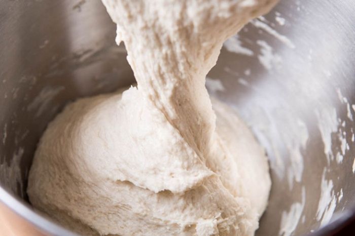- Bột ủ đạt sau khi lấy ra, nhồi sơ lại bằng tay từ 5-7 phút đến khi bột mịn thành khối. Sử dụng dao cắt bột nhựa và cân điện tử chia 49-50g/viên. Các bạn đừng quên phủ khăn ẩm hoặc màng bọc để tránh bột bị khô mặt.