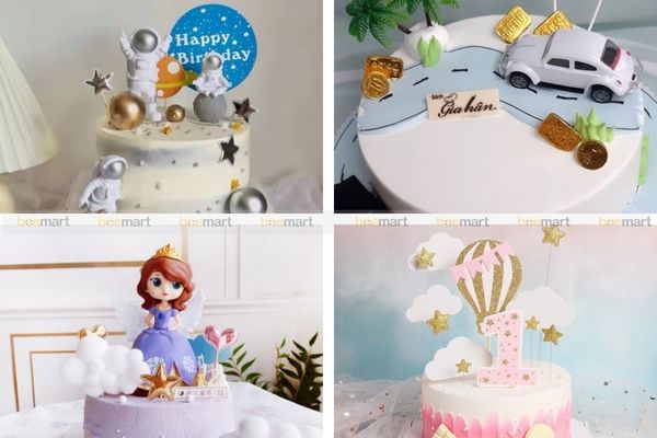 Hiện nay nhiều người thích trang trí bánh sinh nhật theo chủ đề như: khủng long, xe oto, công chúa cho trẻ em, hay các kiểu bánh sang chảnh cho nữ với những phụ kiện thời trang, mỹ phẩm... Với những chủ đề này bạn có thể dễ dàng thực hiện ý tưởng bằng cách sử dụng phụ kiện trang trí là các hình được gắn trên que cứng cáp. Chỉ cần một chút khéo léo, sắp xếp gắn chúng lên bánh sinh nhật là được thôi!