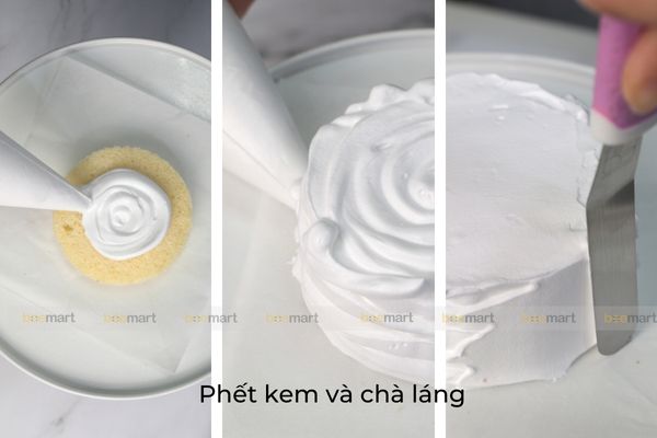 - Sau đó phết kem vào từng lát bánh, dàn đều kem và xếp chồng các lớp bánh lên.
