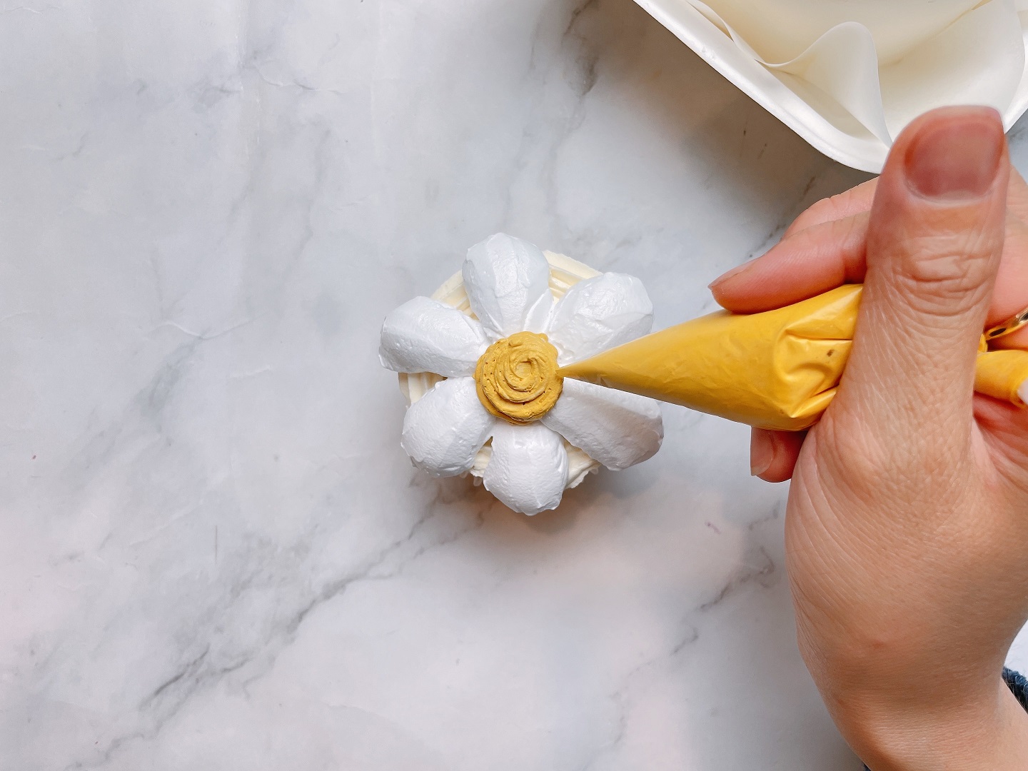 - Cuối cùng sử dụng túi kem màu vàng đậm làm nhuỵ hoa. Bạn chỉ cần tô một điểm tròn ở giữ các tâm của những bông hoa trắng vừa vẽ là hoàn thành.