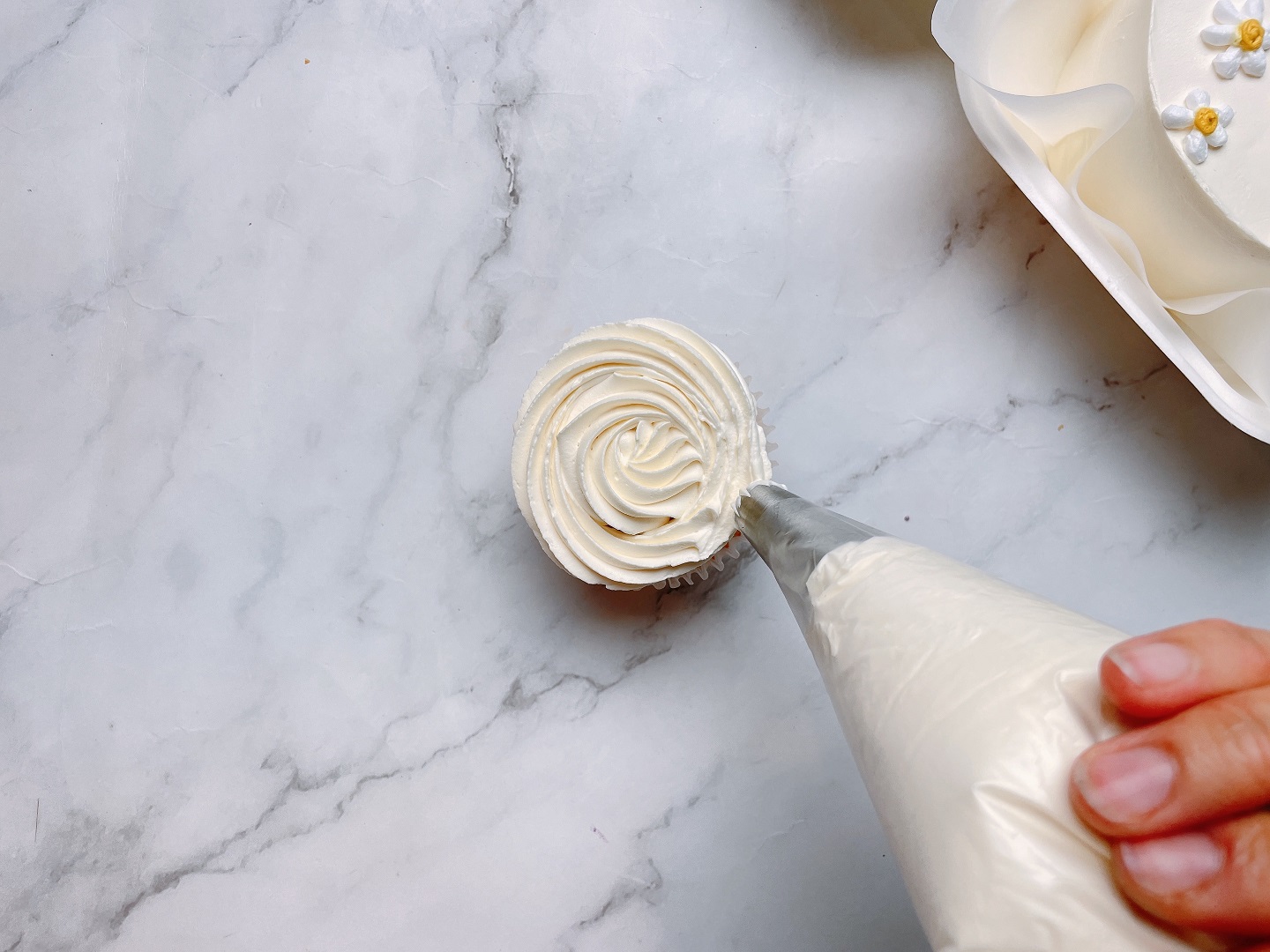 - Sau đó lại tiếp tục lặp lại các bước vẽ hoa cúc như đối với chiếc bánh bento to ban nãy. Nếu ở bánh cupcake này bạn không muốn vẽ nhiều bông hoa nhỏ như trên thì có thể cắt đầu túi kem trắng to hơn để tạo độ rộng cho cánh lớn.