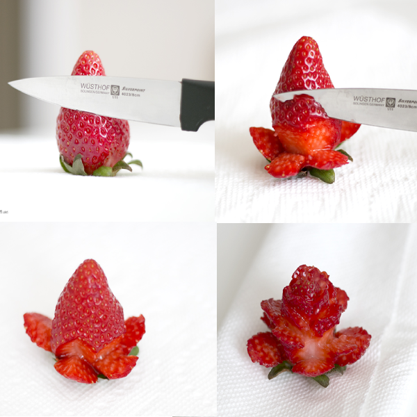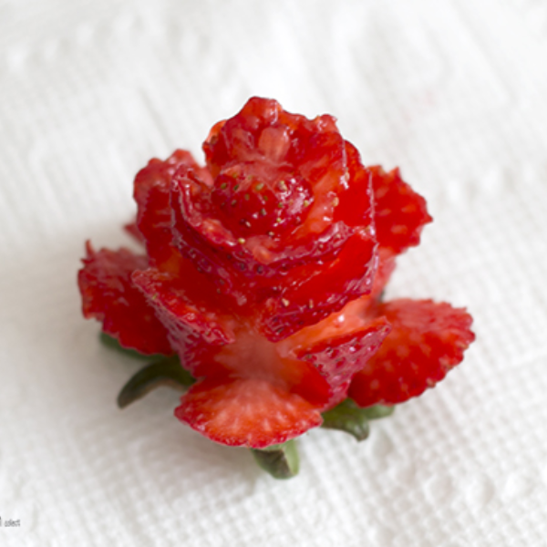 Chỉ với một chiếc dao tỉa hoa quả hoặc dao có mũi nhọn, bạn đã có thể làm cho mình những bông hoa dâu tây đỏ mọng như thế này. Cắm vào que rồi cắm lên trên bánh hoặc đặt chúng xen kẽ trên mặt bánh, bạn đã có một “tác phẩm” hoàn hảo rồi!