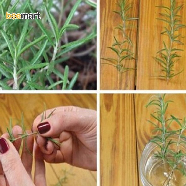 Thêm vào cốc thủy tinh hoặc bình hoa khoảng 5 - 7cm nước cất hoặc nước lọc sạch. Đặt phần cành hương thảo giâm vào trong nước để phần đuôi cắt ngập trong nước. Đảm bảo thay nước thường xuyên để giữ nước luôn sạch.